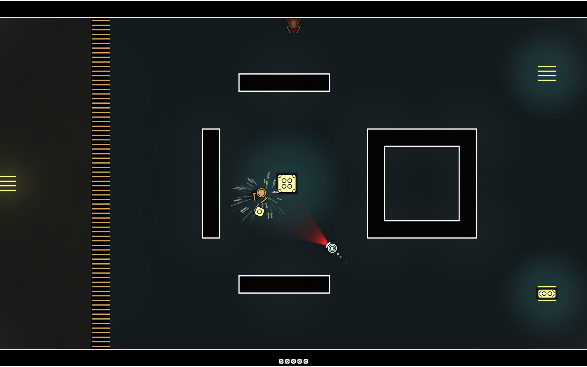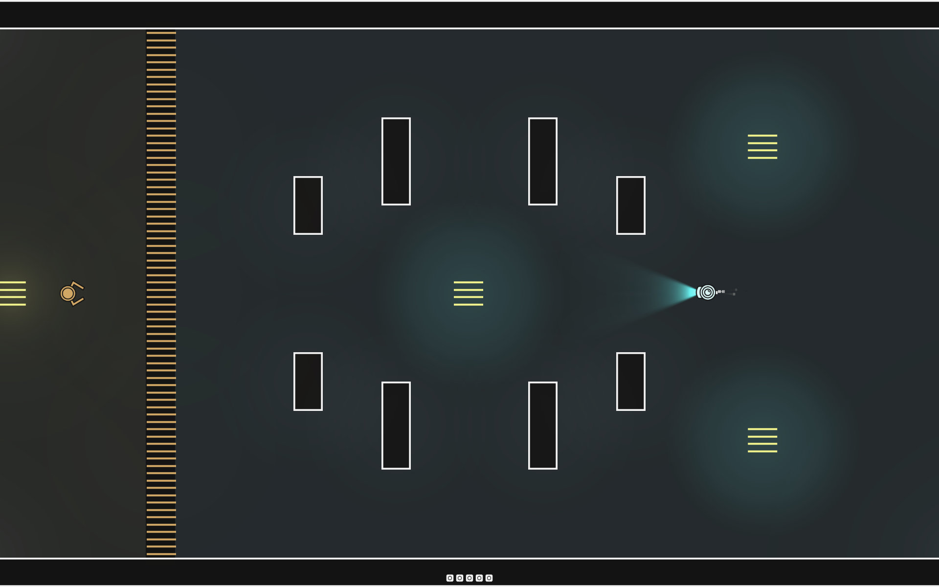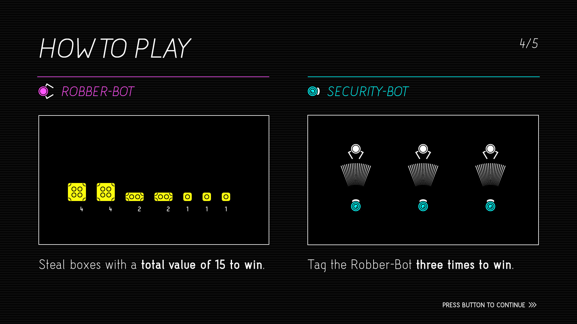 Robo Robbers is a two-plaer heist game. One players takes the role of a robber-bot that has to collect crates and bring them to a target area. The second player controls a security-bot that has to prevent crates from being stolen. However, there is one important detail: The robber-bot is invisible, even to the player who controls it. Only when the it is near a light-source or carrying a crate, the bot becomes visible.